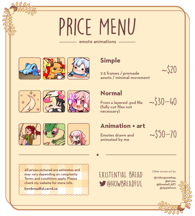 Hi there! I'm Existential Bread aka Bready and I animate emotes and other motion graphics.COMMISSIONS ON HIATUS!